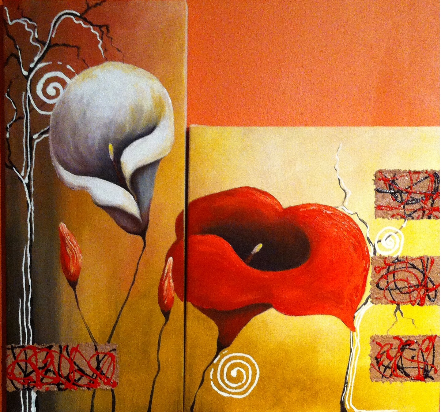 Painted a 12″ x 6″ mini tree series 3 and an abstract flower diptych.